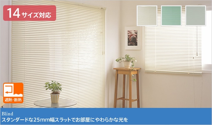 シャープなラインが美しい、25mm幅スラット(羽)のアルミブランド。ベーシックなアイボリー色は、お部屋を広くすっきりと見せます。