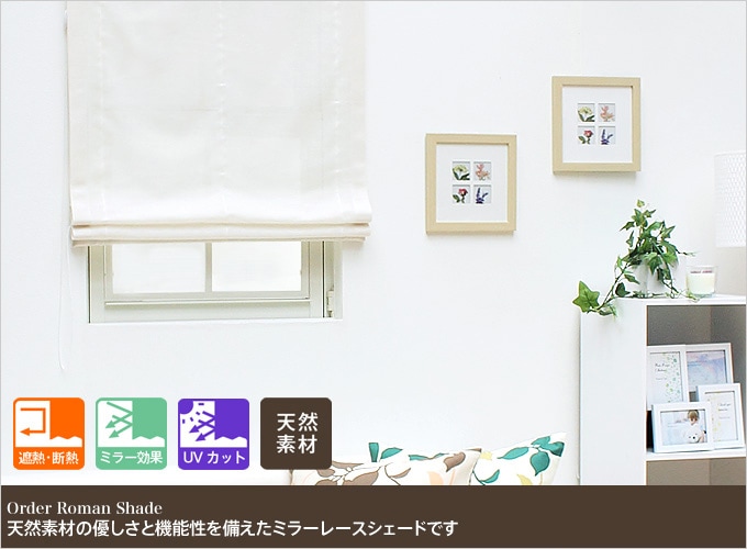 綿とミラー効果を持たせたナチュラルなレースローマンシェードです。