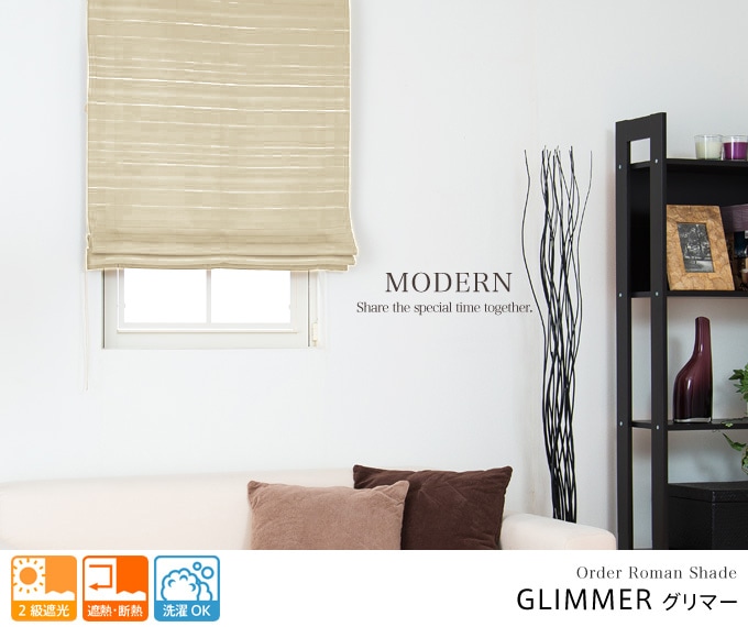 高級感あふれる、ラグジュアリーな無地のローマンシェード。ライトのあたる角度によって、キラッと輝きをはなつヨコ糸がアクセント。光沢が美しいカーテンは寝室だけではなく、リビングのカーテンにもおすすめです。