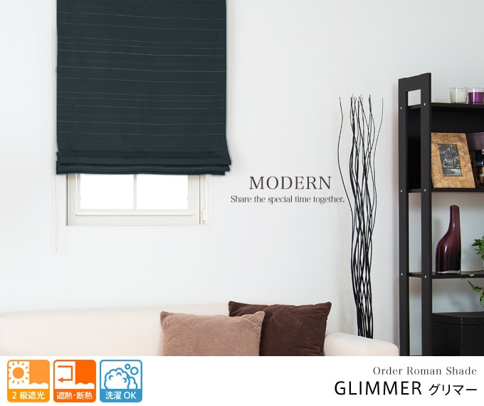 落ち着いたカラーの生地に、さまざまな光沢のボーダーがランダムに配置されたモダンなデザインの2級遮光のローマンシェードです。遮光ローマンシェードには断熱効果があり、お部屋の冷暖房の効率がよくなります。