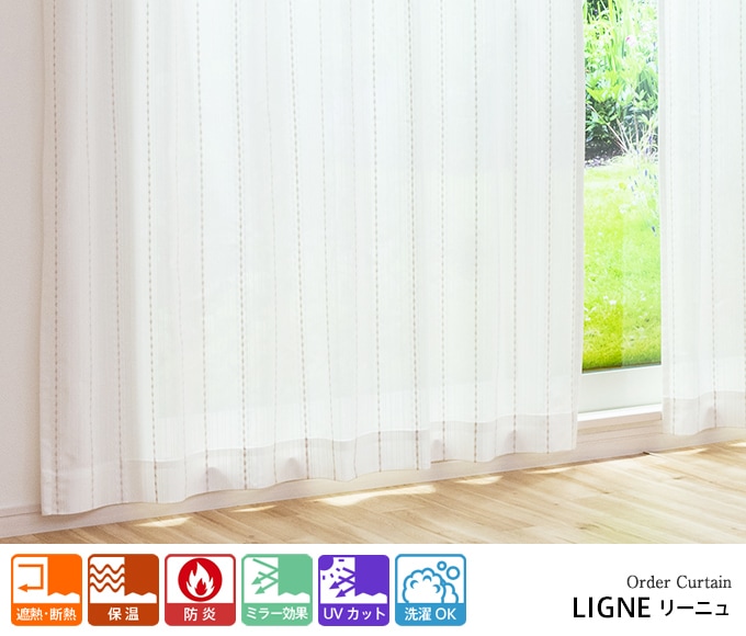 オーダーカーテン/夜も透けにくいストライプ柄の入ったシンプルな防炎ミラーレースカーテン「トリコット ライン」(ホワイト)