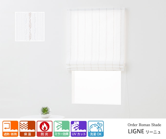 ナチュラルな色合いのエレガントなストライプ柄 防炎UVカットミラーレースローマンシェード「リーニュ」
