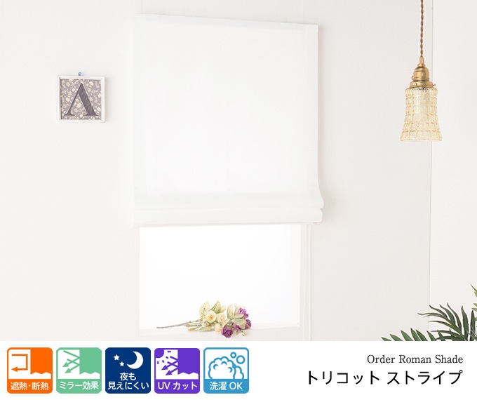 今お使いのメカをそのままに、幕体(カーテン生地)だけを取り替えできます。ストライプ柄の防炎UVカットミラーレースローマンシェードです。外から室内が見えにくくなります。