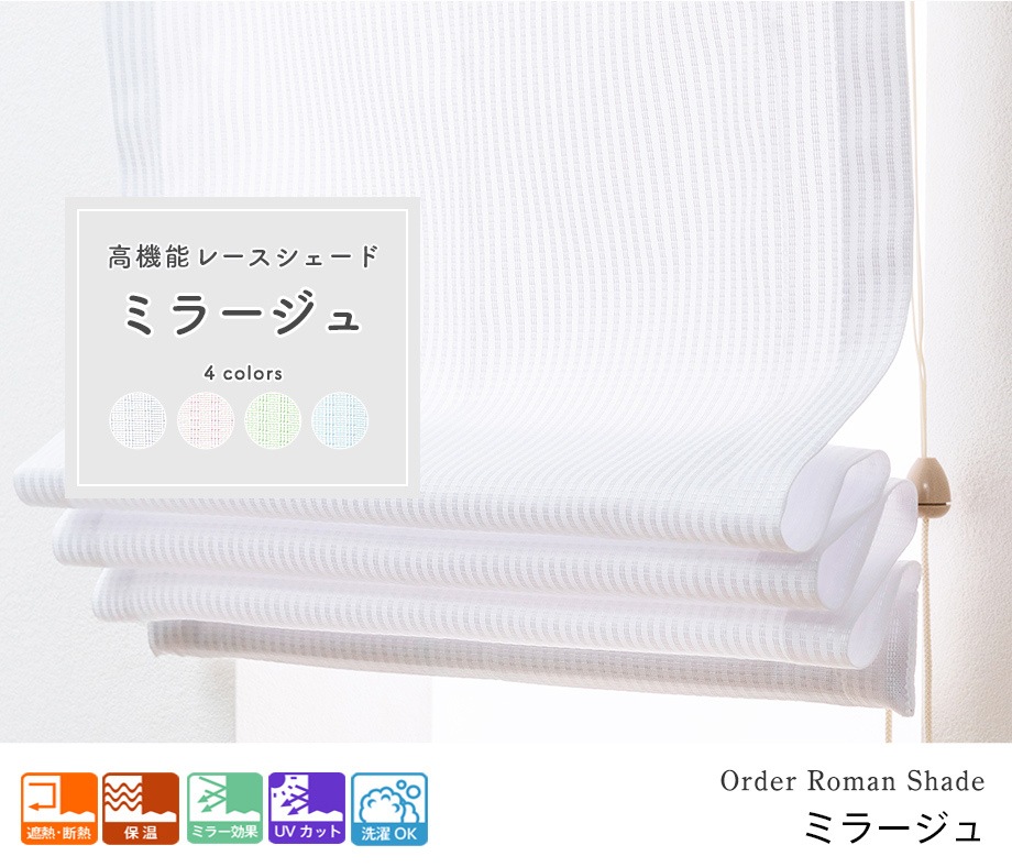 夏は太陽光を反射する素材が部屋を涼しく、冬には生地が太陽光を取り入れて、赤外線を出して暖かい、エアコン効率が良くなる防炎ミラーレースローマンシェードです。