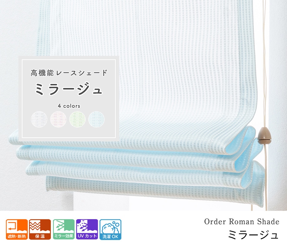 夏は太陽光を反射する素材が部屋を涼しく、冬には生地が太陽光を取り入れて、赤外線を出して暖かい、エアコン効率が良くなる防炎ミラーレースローマンシェードです。