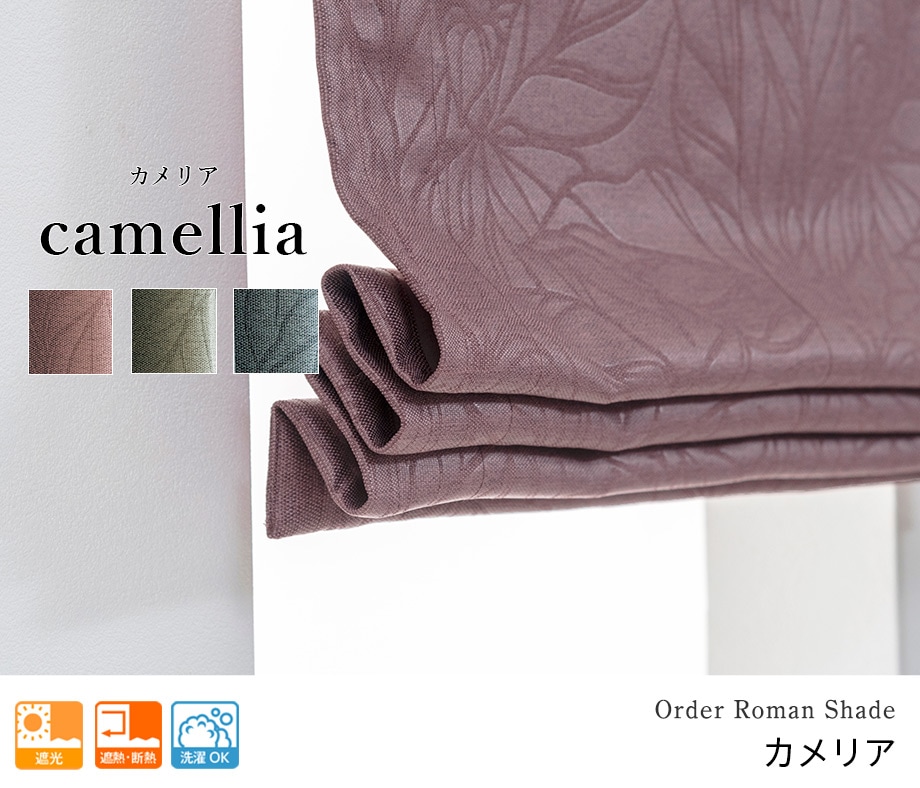 エレガントなエンボス加工を施したボタニカル柄の1級遮光ローマンシェード「カメリア」バーガンディーについてつぶやく