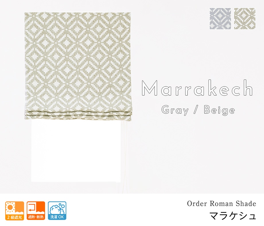 ジグザグで描かれた四角形を規則正しく並べた幾何学模様の遮光ローマンシェードです。 朝日や眩しい西日の光をほどよく遮る2級遮光で、見た目も機能も充実したカーテンです。