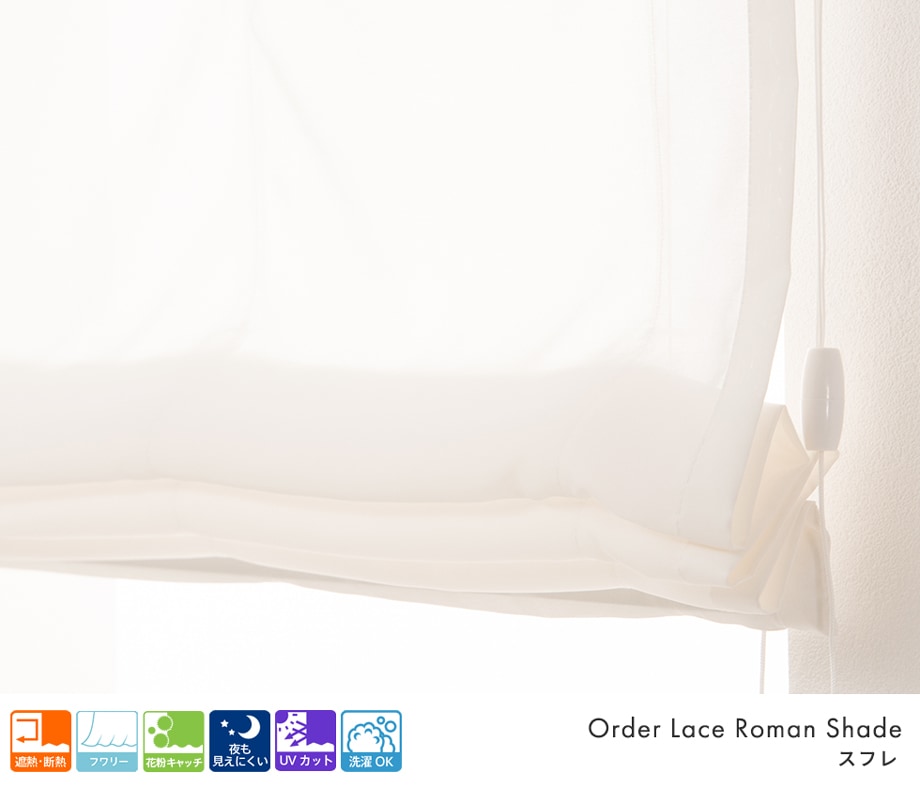 今お使いのメカをそのままに、幕体(カーテン生地)だけを取り替えできます。防炎機能やUVカット機能を備えた、シンプルで合わせやすいレースローマンシェードです。清潔感のある窓辺を演出できるレースカフェカーテンは新しい毎日にぴったりの1枚で、あなたのお気に入りの空間にそっと寄り添います。
