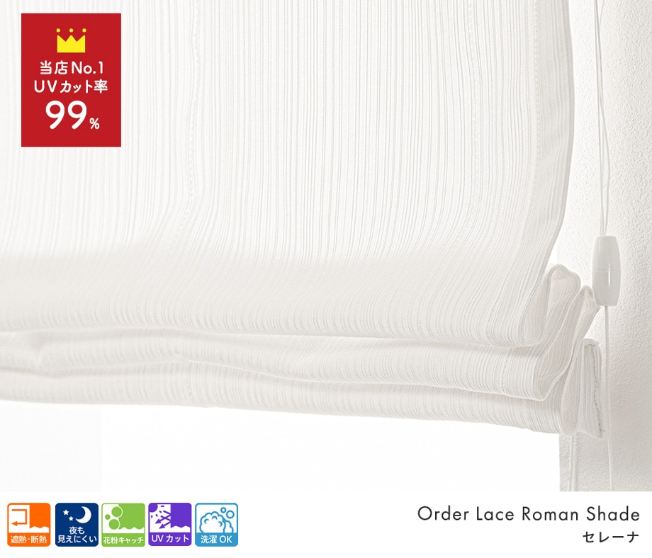 今お使いのメカをそのままに、幕体(カーテン生地)だけを取り替えできます。高機能レースローマンシェードです。UVカット率は驚きの99%!紫外線による家具や床の劣化、お肌の日焼けを最大限に防ぎます。