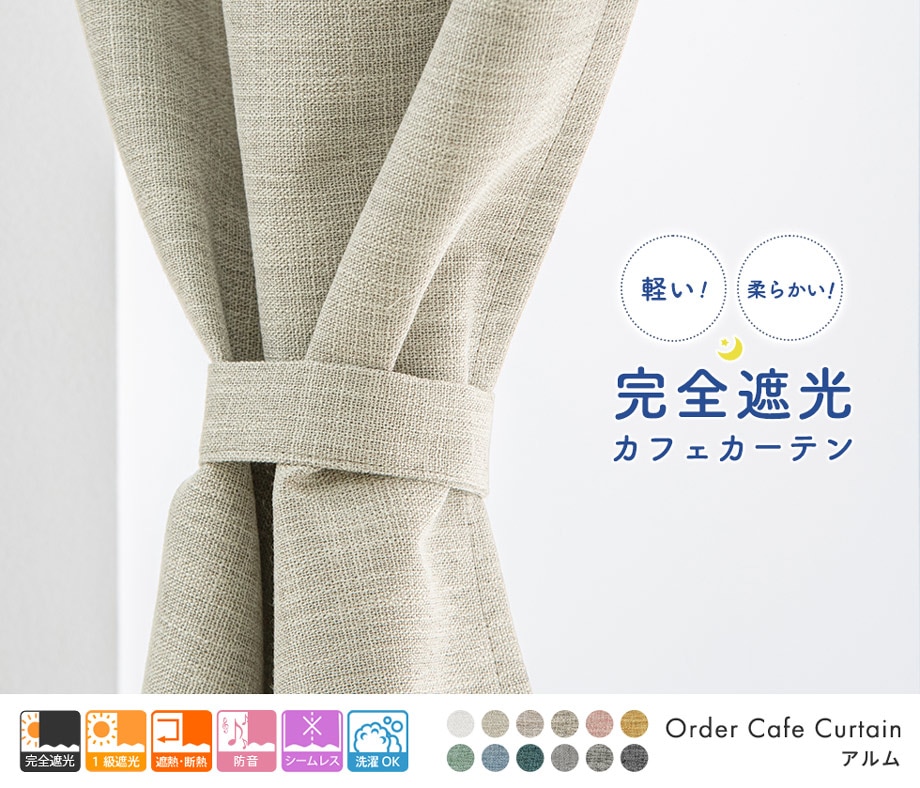 “ボンディング加工”で軽さ&柔らかさを実現 軽さと柔らかさの秘密は、表生地と裏生地の間に遮光フィルムを挟みこんで接着したボンディング加工。 従来の完全遮光のようにアクリル樹脂を使用しないので、高い遮光性を保ちながらもナチュラルで柔らかい風合いを楽しめます。 お手入れの負担を軽減 アクリル樹脂の完全遮光生地と比べ、約24%の軽量化を実現しました。 お手入れの際の取り付け・取り外しも手軽にできます。 素材感のある生地 薄くて柔らかい感触を生かした、素材感のある風合いです。 濃淡のある糸でざっくりと織られており、ナチュラルテイストなお部屋にも馴染みます。 シームレスで美しい見た目 当店のカフェカーテンは幅141cm以上で継ぎ目ができてしまいます。 アルムは原反を横方向に使用することで、大きいサイズでも継ぎ目なしで作成が可能。すっきりとした統一感のある仕上がりになります。 機能性も充実 完全遮光 夜勤の方や 強い日差しが当たる窓におすすめ 遮熱・保温 エアコン効率アップで節電 防音 ピアノや赤ちゃんの泣き声など 高音に効果を発揮