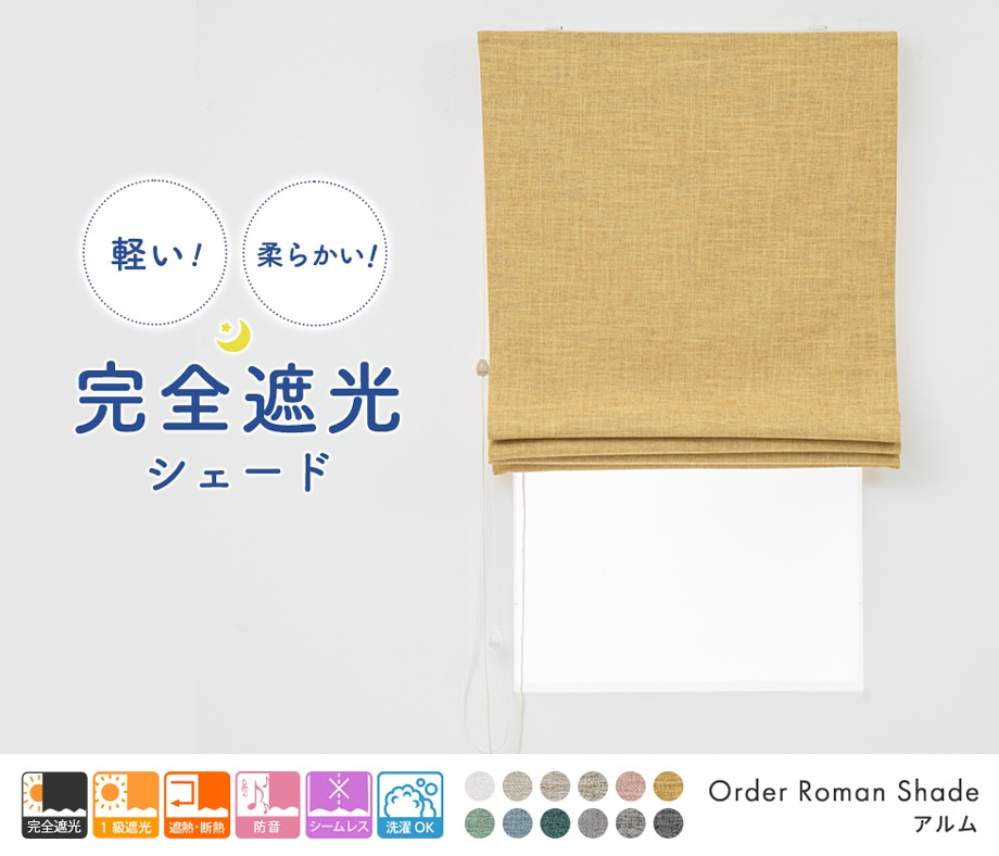 オーダーカーテン通販【aiika】 > ローマンシェード > シングルシェード > 遮光シェード > 3層構造で軽く柔らかい完全遮光ローマンシェード「アルム」イエロー