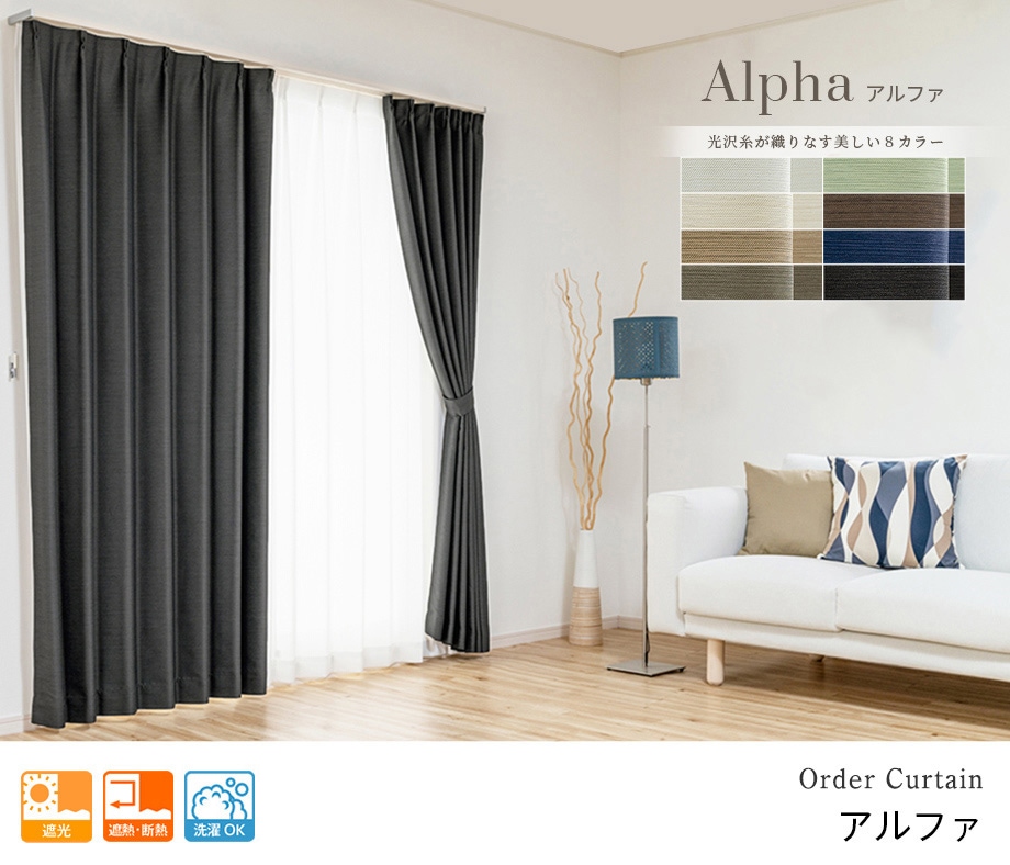 オーダーカーテン通販【aiika】 > カーテン > オーダーカーテン > 遮光カーテン > 主張しすぎない光沢と繊細な織り感が美しい遮光カーテン「アルファ」非防炎タイプ チャコールブラック(1級遮光)