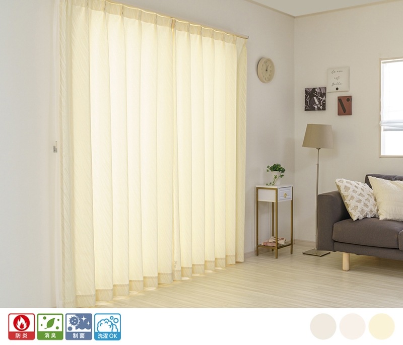 優雅な流れ模様を織りで表現したジャガード生地。ペールトーンの淡い色合いが窓辺を柔らかく、上品な雰囲気にしてくれます。 制菌・消臭効果で室内を清潔に保つことができ、さらに防炎機能付きなので、医療・福祉施設といった防炎機能が求められる場所にも最適です。