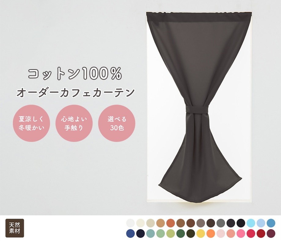 綿(コットン)100%を使用した、さらっとした触り心地が特徴のオックス織り天然素材カフェカーテンです。シンプルな無地ながらも雰囲気ある上品な生地で、綿のやわらかな質感も特徴です。