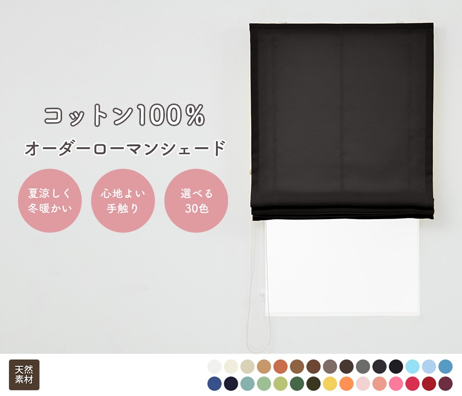 綿(コットン)100%を使用した、さらっとした触り心地が特徴のオックス織り天然素材ローマンシェードです。シンプルな無地ながらも雰囲気ある上品な生地で、綿のやわらかな質感も特徴です。