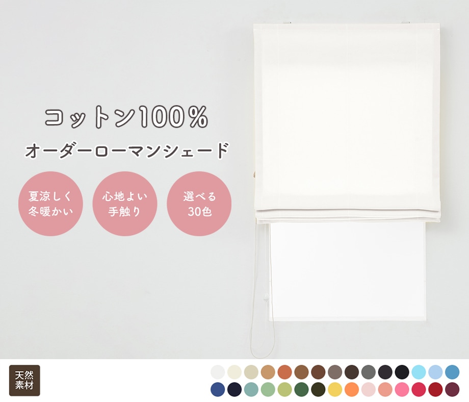 今お使いのメカをそのままに、幕体(カーテン生地)だけを取り替えできます。綿(コットン)100%を使用した、さらっとした触り心地が特徴のオックス織り天然素材ローマンシェードです。シンプルな無地ながらも雰囲気ある上品な生地で、綿のやわらかな質感も特徴です。