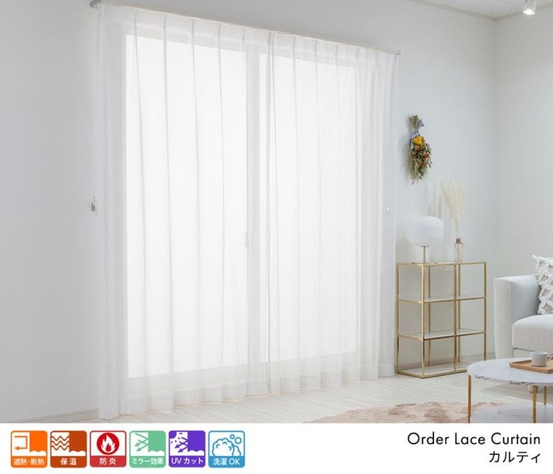 夏は太陽光を反射する素材を使って涼しく、冬には太陽光を取り入れ生地から赤外線を出して暖かい、エコな消防法対応の防炎ミラーレースカーテン。白いカーテンは清潔感があり、お部屋を明るくする効果があります。