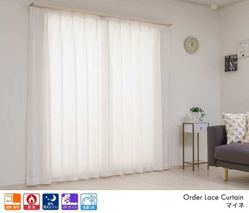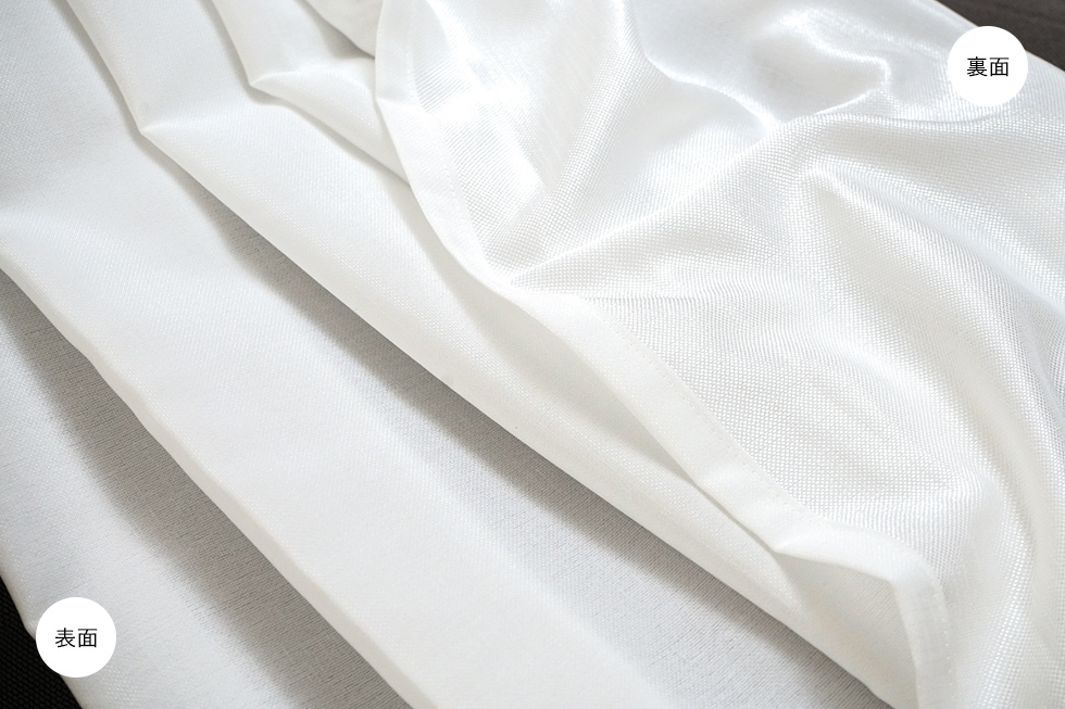 どんなインテリアにも馴染みやすい、無地のシンプルなレース。 表面(室内側)は光沢がなく、さらさらとした心地よい手触りです。 裏面(室外側)は特殊な光沢糸を織り込んでおり、太陽光を反射して室内を透けにくくする効果があります。