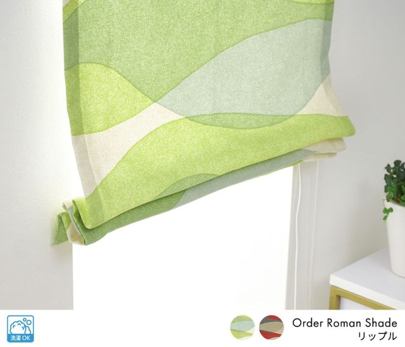 鮮やかなカラーリングと波のような躍動感が魅力のローマンシェード。グリーンまたはレッドの美しいウェーブ柄が特徴で、北欧調のモダン家具との相性も抜群です。