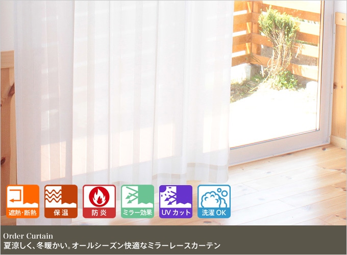 夏は太陽光を反射する素材を使って涼しく、冬には太陽光を取り入れ生地から赤外線を出して暖かい、エコな消防法対応の防炎ミラーレースカーテン。白いカーテンは清潔感があり、お部屋を明るくする効果があります。