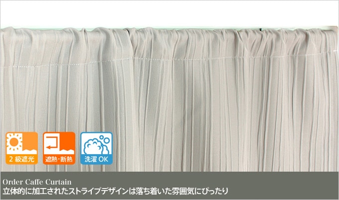 特殊な織り方と加工により、生地を縦ストライプ調にふくれさせたグレーの2級遮光カフェカーテン。